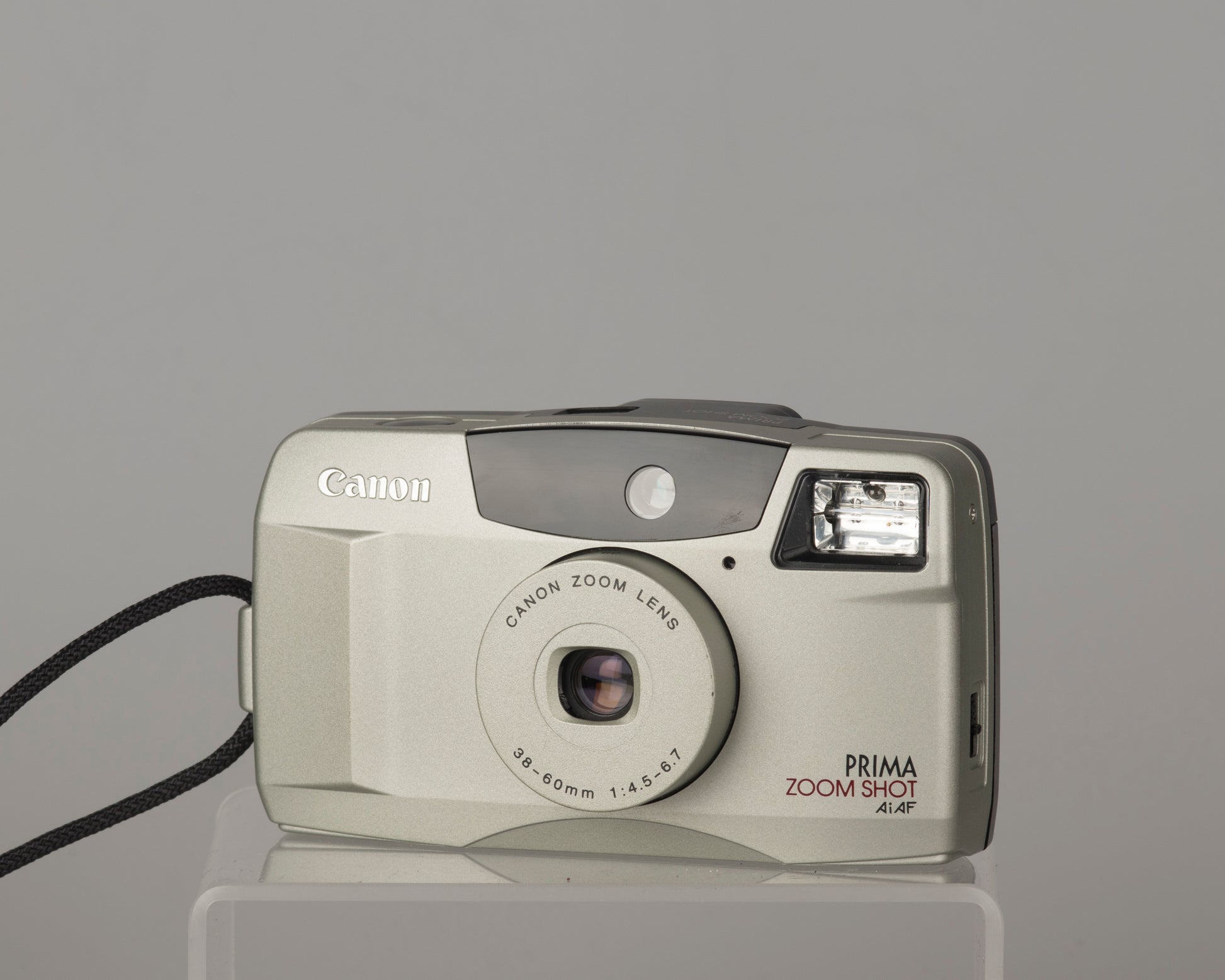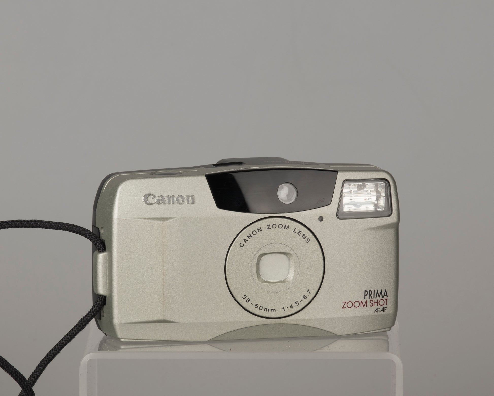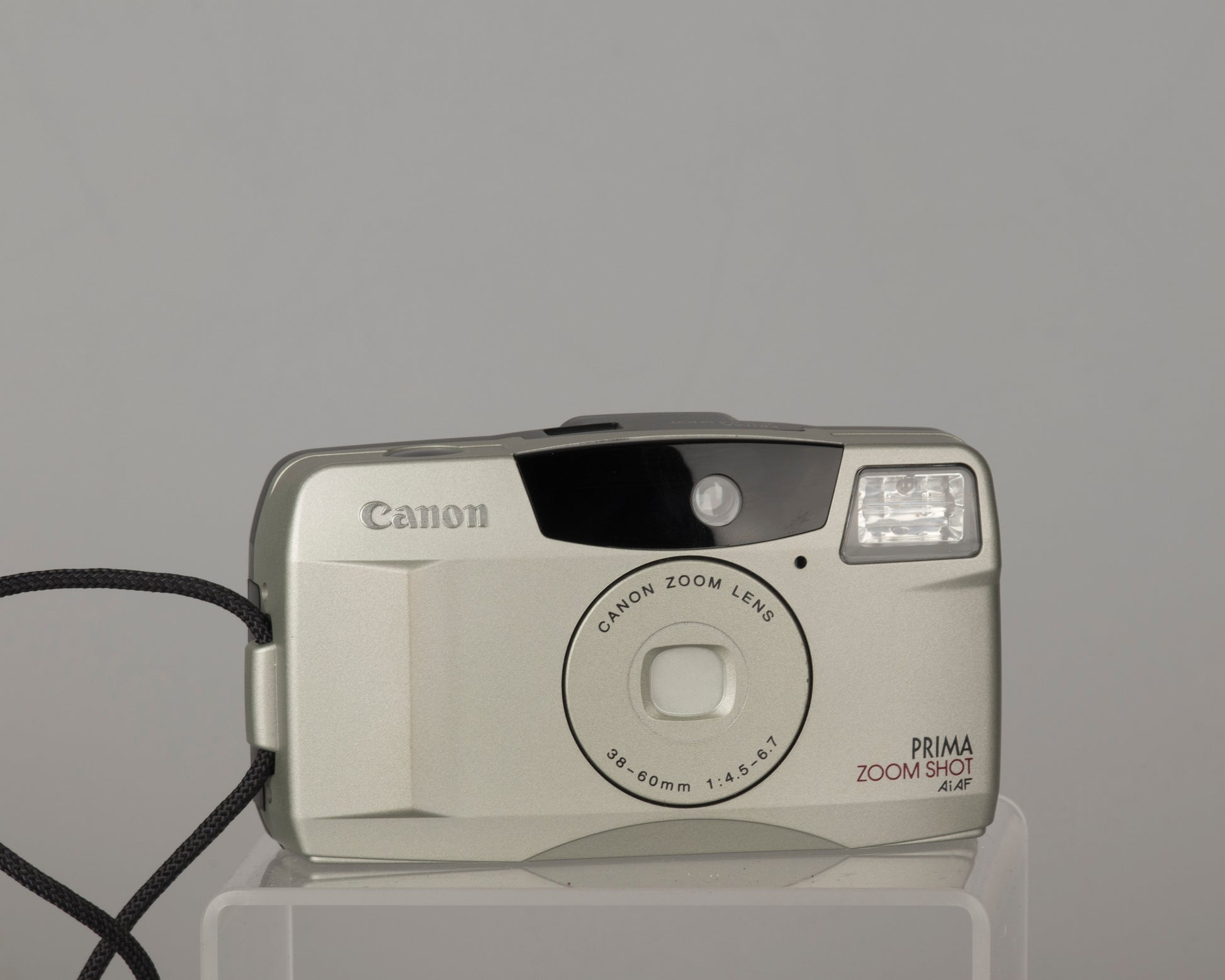 Le Canon Prima Shot Zoom (appelé Sure Shot 60 Zoom ou Autoboy Juno dans certains pays) est un zoom point-and-shoot de bonne qualité du milieu des années 1990. Il dispose d'un objectif 38-60 mm bien conçu (6 éléments en 6 groupes) et d'un autofocus 5 points très précis. L'étui d'origine est inclus. L'appareil photo nécessite une pile au lithium CR123 (en option).