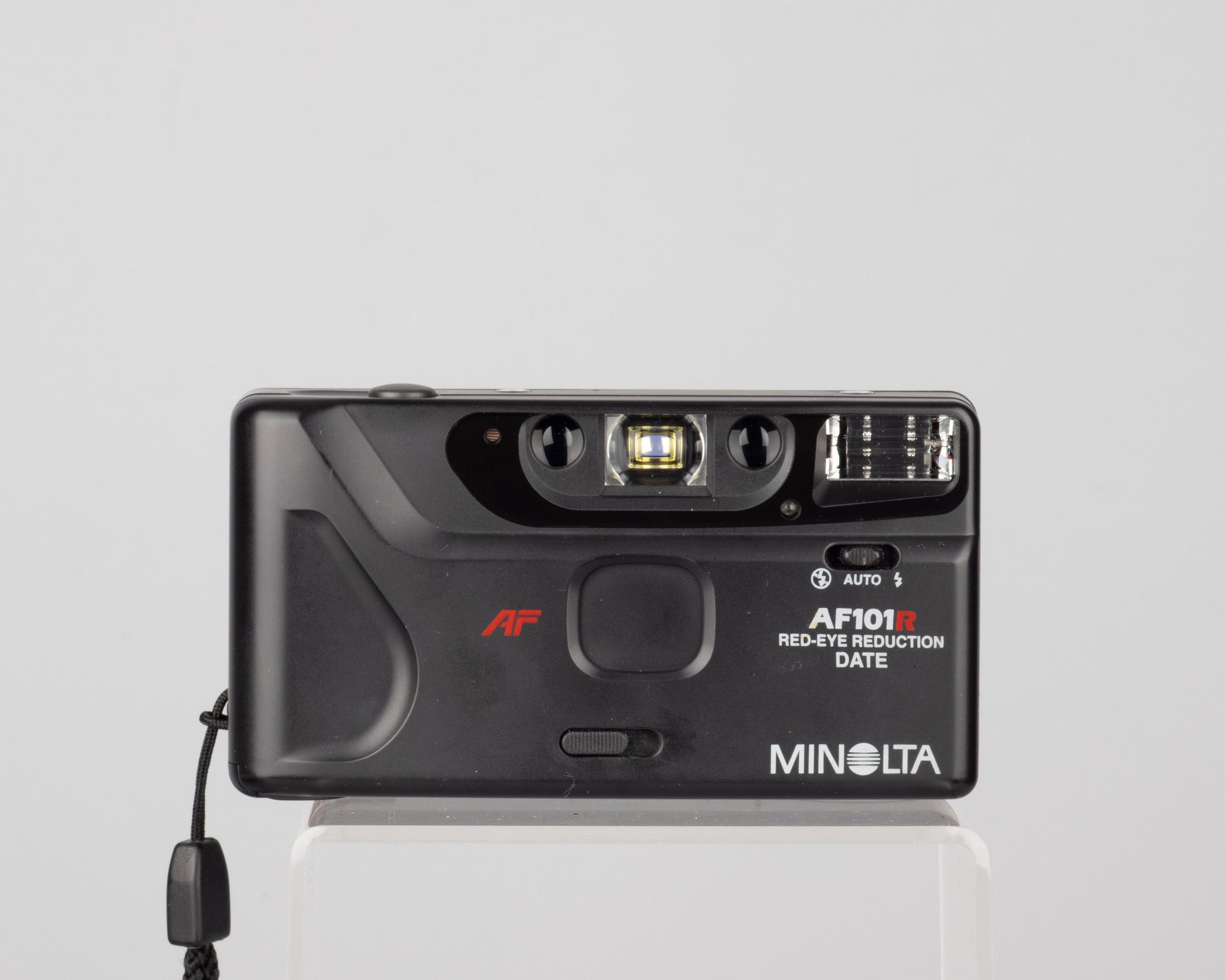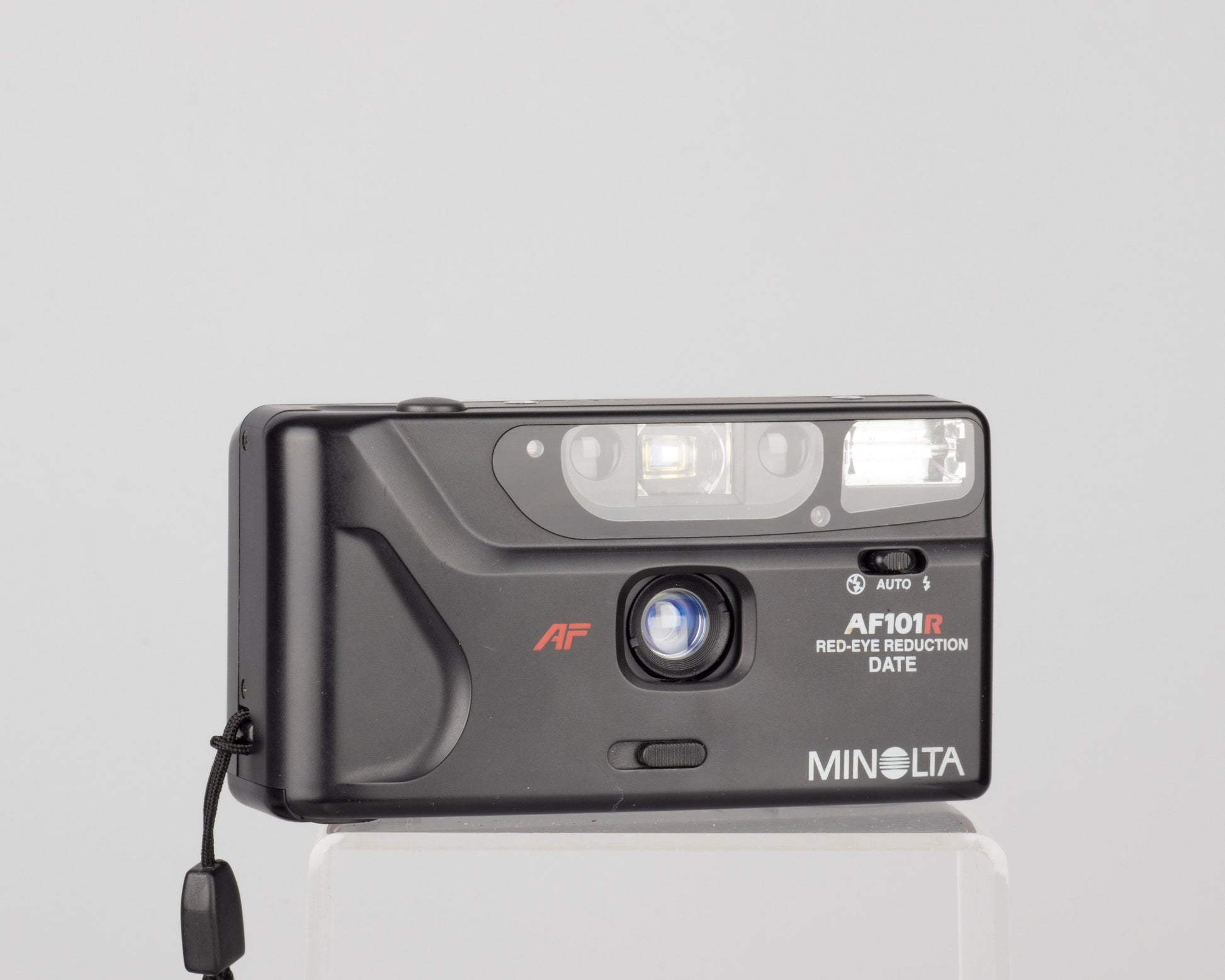 The Minolta AF101R is a elegantly designed, compact autofocus 35mm point-and-shoot camera from circa 1994. It features a good performing fixed wide-angle 28mm lens.
